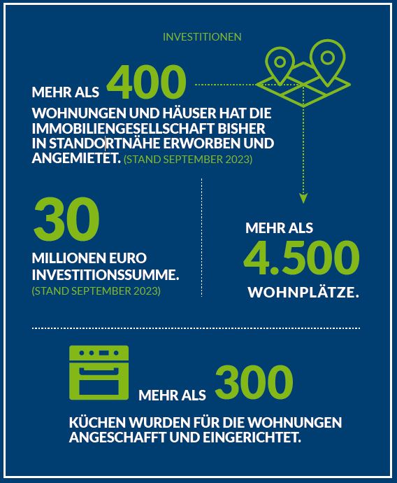 Insgesamt hat die Immobilien Gesellschaft seit dem Sommer 2020 rund 4500 Wohnplätze für die Mitarbeiterinnen und Mitarbeiter der Premium Food Group geschaffen. Es ist ein laufender Prozess, der fortgeführt wird, um die Standards der Wohnungen Schritt für Schritt weiter anzuheben. Sukzessive trennen wir uns zudem von alten Wohnungen, um sie durch neue mit höheren Standards zu ersetzen. Dadurch sollen sich unsere Angestellten noch wohler bei uns fühlen und sich bestenfalls langfristig an uns binden.